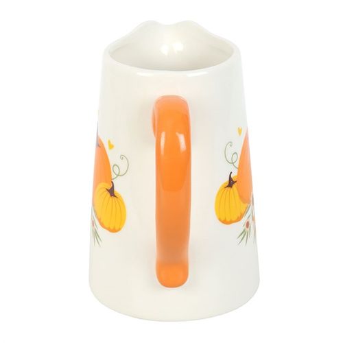 Made from ceramic, this autumnal soft white jug is features a bright pumpkin and heart design and cheerful floral details, and is accented by a contrasting orange handle, making it a perfect decorative piece for autumn or Halloween, and is ideal for displaying fresh flowers, dried arrangements, or simply styled on its own as a decorative piece, and it would make a wonderful gift for a loved ones birthday.