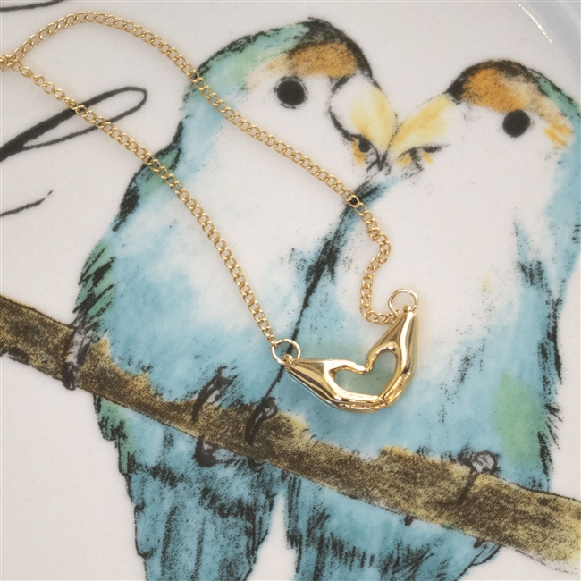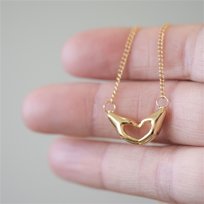 This gold plated 18 inch curb chain is completed with a pendant in the shape of two gold plated hands, that come together to form a beautiful heart shape, making it a gorgeous gift for any occasion.