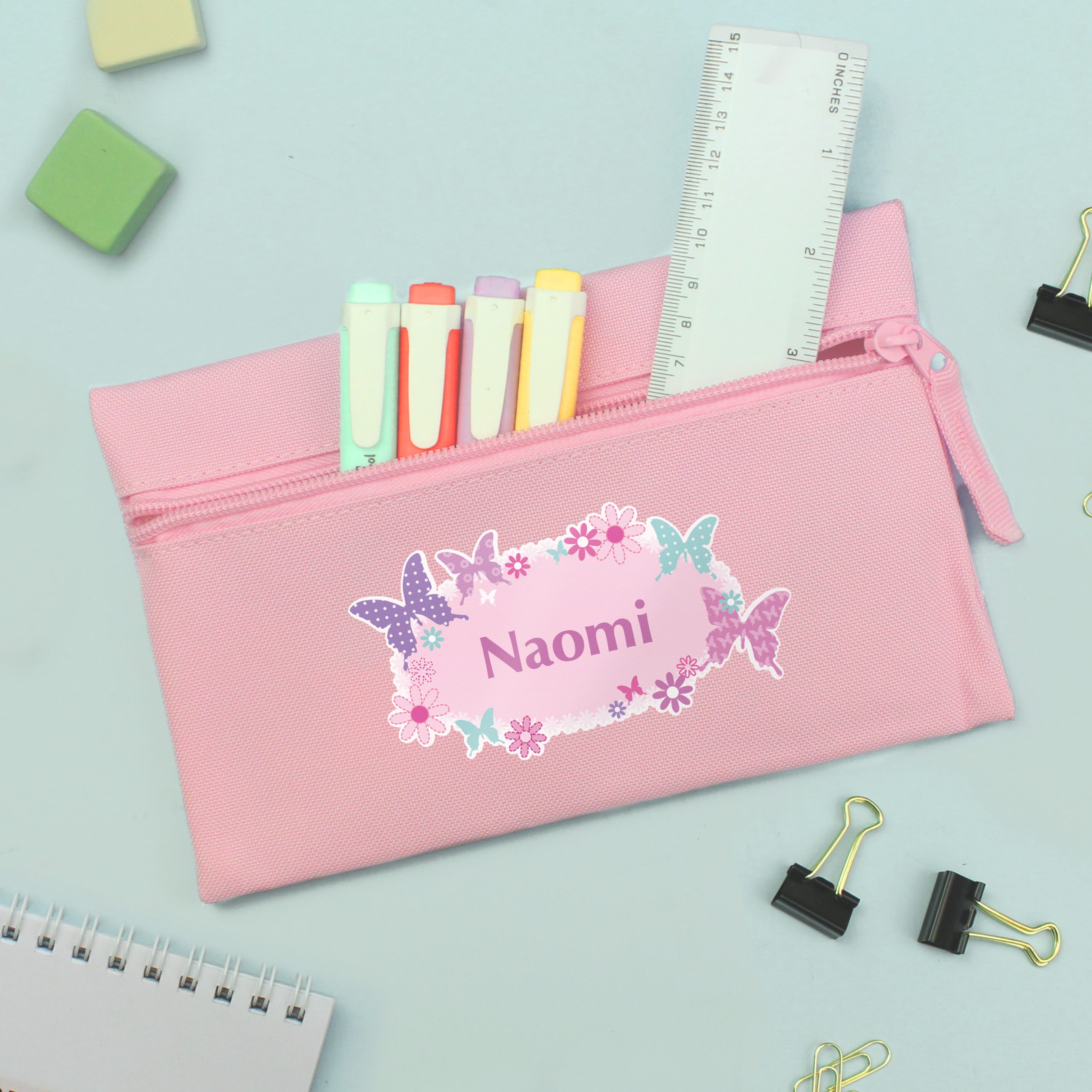 This Butterfly Pink microfibre pencil case can be personalised with any name up to 12 characters.
