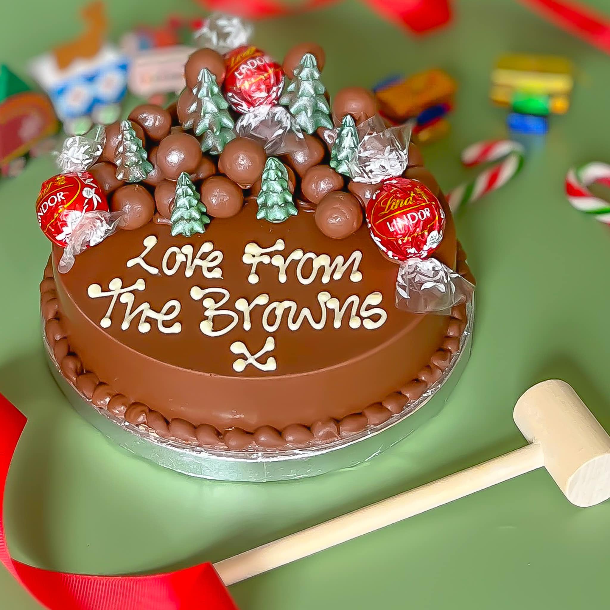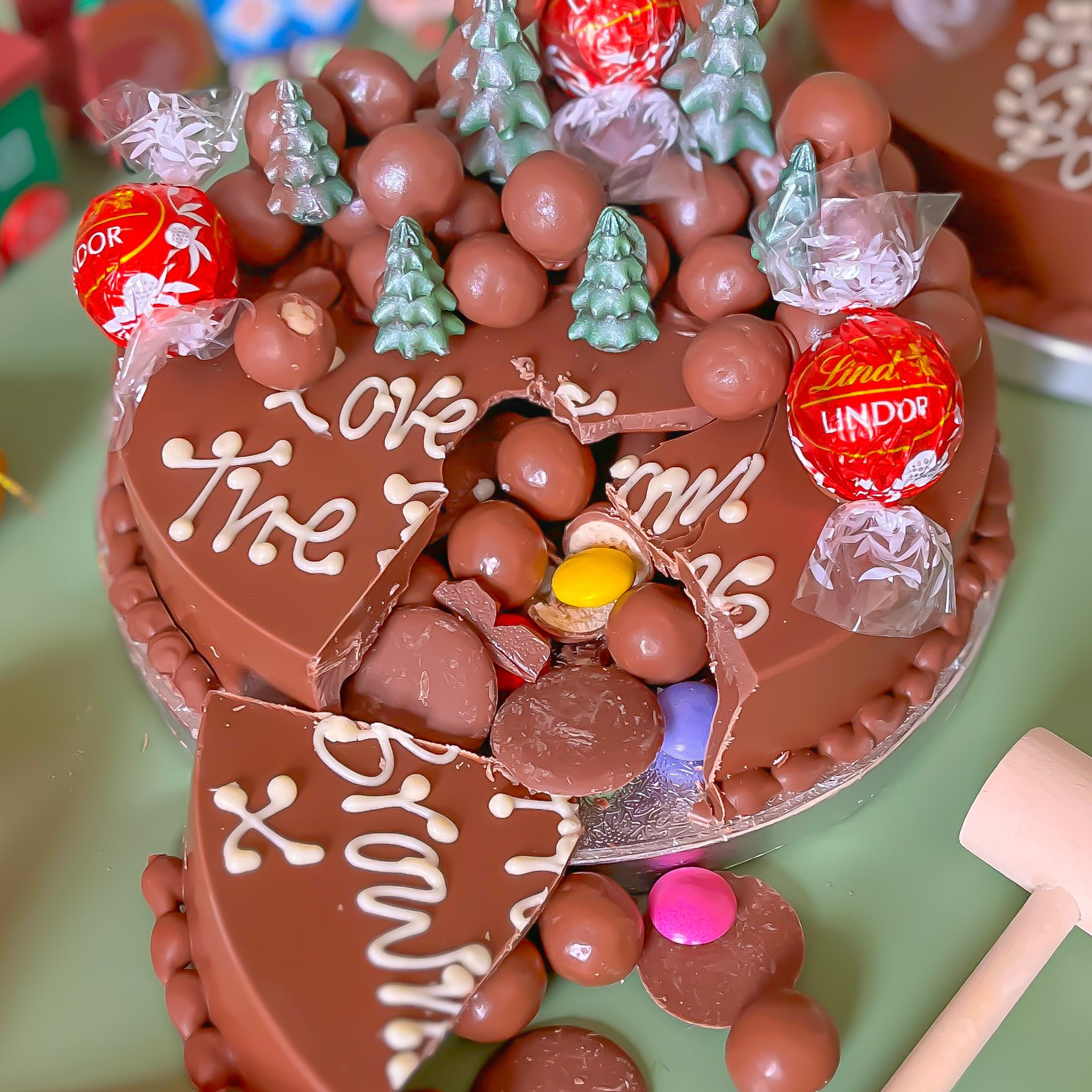 This winter wonderland smash cake is made from a deliciously creamy milk chocolate shell, and the inside contains an array of chocolate from Maltesers®, Chocolate Buttons® and Smarties®. The outside of the cake is topped with little mountains of even more yummy Maltesers®, creamy milk chocolate Lindt Lindor®, and a forest of adorable milk chocolate Christmas trees, finished with green lustre.
