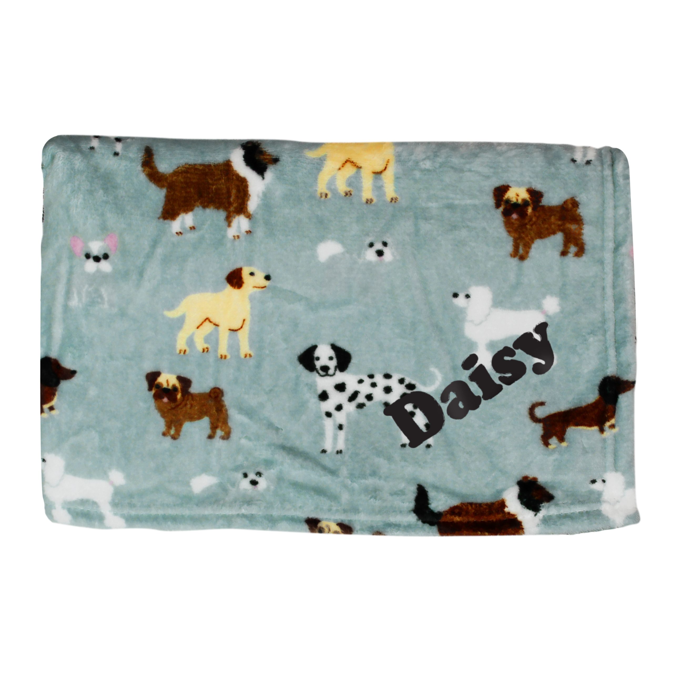 This snuggly soft blue fleece blanket has a design that features a selection of your favourite pooches, along with your dogs name added on the front in a bold black font. Use it to line your dog’s basket or bed, or if your dog likes jumping up on the sofa, the blanket could be used to protect it from your dog’s claws and muddy paws, it’s perfect to wrap your pooch up warm and cosy.