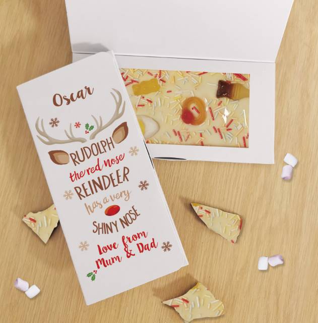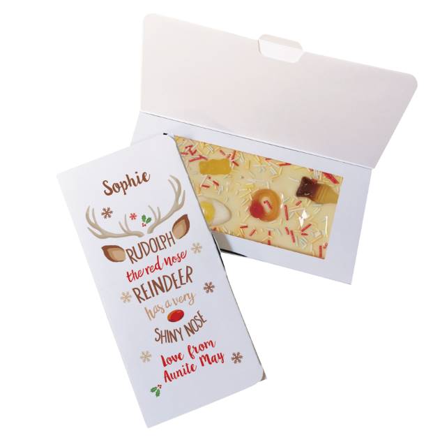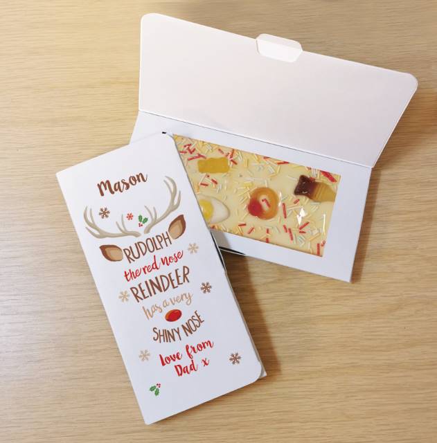 It’s Christmas time, and if you are looking for a Christmas Eve gift or stocking filler that is personal and fun, this Personalised Rudolph White Chocolate Card is the perfect gift!