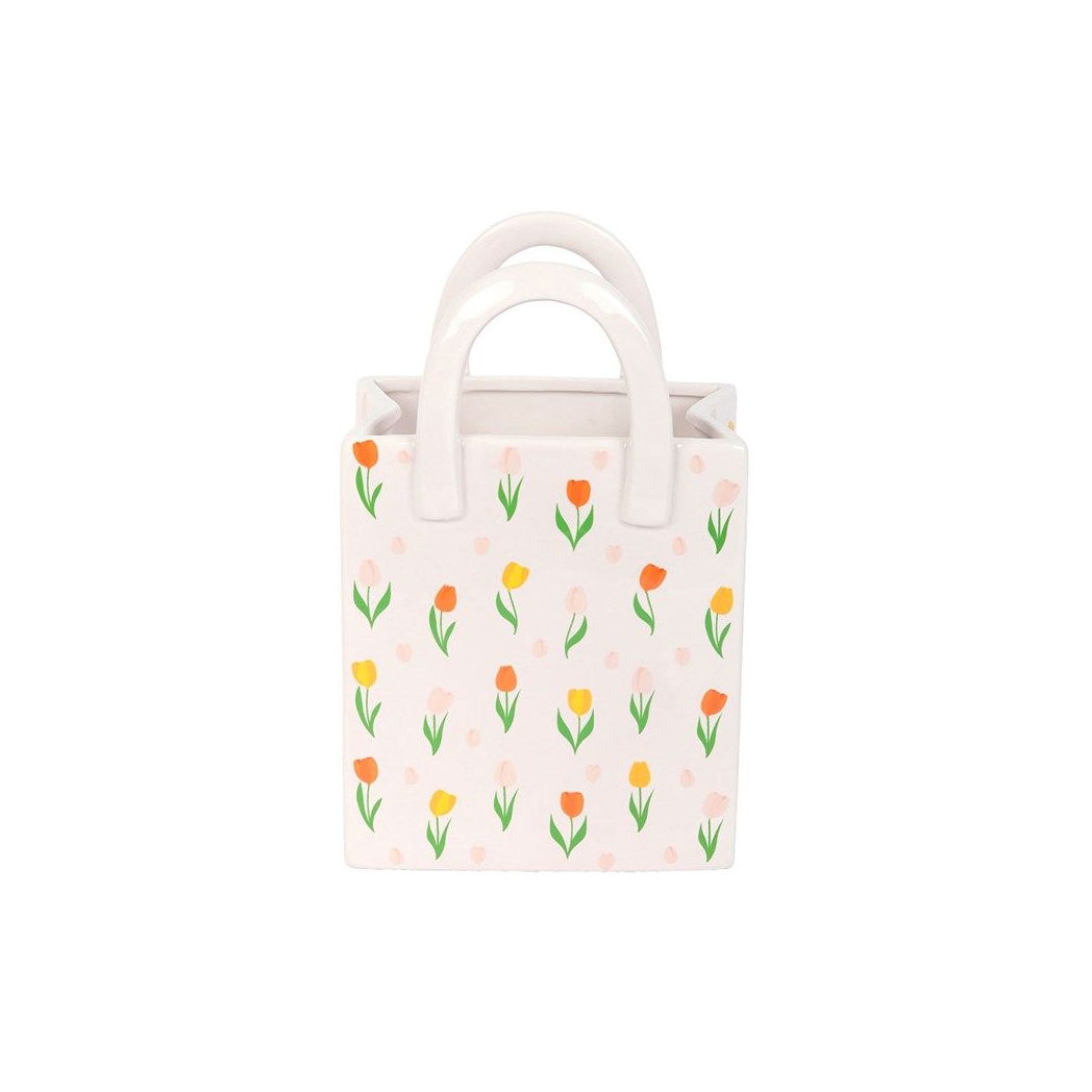 Add a fresh pop of charm to any space with this delightful Tulip Print Ceramic Bag Flower Vase.